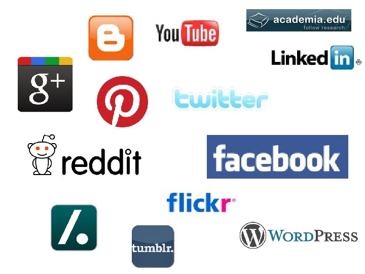 What are social media? Do you know your reddits from your tweets? Social networks – Facebook, Twitter, Google+, Linked. In Social bookmarks – Delicious, Reddit, Digg, Stumble. Upon, Slashdot, Pinterest Blogs – Wordpress, Blogger, Tumblr, Twitter (microblog), individual sites Social media (generic) – You. Tube, Vimeo, Flickr, Instagram, Sound. Cloud Plus… 1, 000 s more