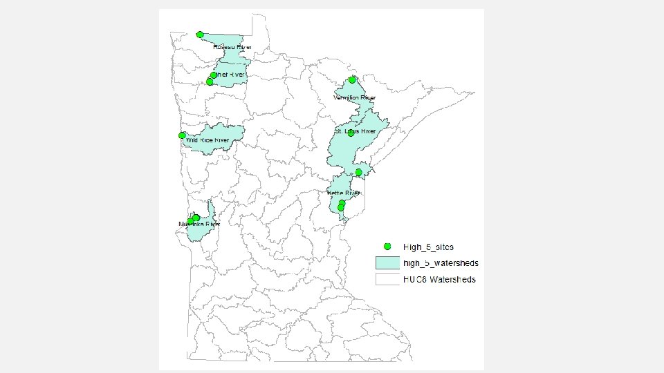 BIOTA COLLECTION • RESEARCHERS FROM UNIVERSITY OF WISCONSIN – LA CROSSE • COLLECT WATER, SESTON, PERIPHYTON, BENTHIC MACROINVERTEBRATES, AND SMALL (PREY) FISH • MULTIPLE SITES IN EACH RIVER – SAME SCHEDULE AS OTHER COLLECTION WITH ADDITION OF ST. LOUIS RIVER IN 2016 • HUNDREDS OF BIOTA SAMPLES COLLECTED (AND FREEZE-DRIED) FROM 33 SITES IN THE SIX WATERSHEDS • UW-LACROSSE WILL ANALYZE SAMPLES FOR HG AND MEHG; SUBSAMPLES WILL BE SENT TO UMISOTOPE LAB FOR CARBON AND NITROGEN ISOTOPES • SPORT FISH COLLECTED BY MDNR & MPCA