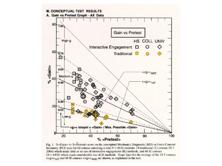 Richard Hake (Interactive engagement vs traditional methods) http: //www. physics. indiana. edu/~hake/ Traditional (lecture) Interactive (active/cooperative) <g> = Concept Inventory Gain/Total