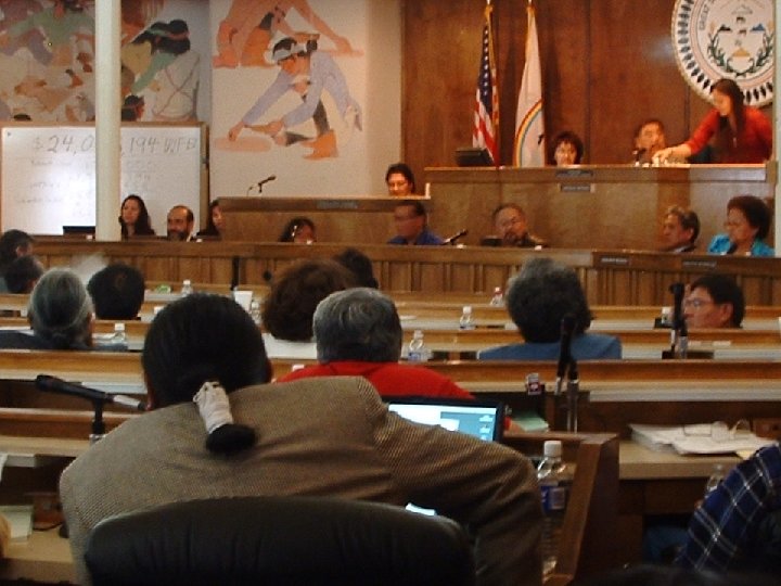 Navajo Nation Government � The discovery of oil on Navajo land in the early 1920's promoted the need for a more systematic form of government. � Critical issues and enact legislation to determine the future of the Navajo people. Reorganized in 1991 to form a three-branch system - Executive - Legislative - Judicial � The Navajos conduct what is considered to be the most sophisticated form of Indian government. In 1923, a tribal government was established to help meet the increasing desires of American oil companies to lease Navajo land for exploration. Navajo government has evolved into the largest and most sophisticated form of American Indian government. Currently The Navajo Nation Council Chambers hosts 24 (formerly 88 ) council delegates representing 110 Navajo Nation chapters. While the Council is in session, you'll likely hear delegates carry on the tradition of speaking in Navajo, providing a perfect example of how the Navajo Nation retains its valuable cultural heritage while forging ahead with modern progress. When the Council is not in session, legislative work is done by 5 standing committees (formerly (12) of the Council. Inside the circular Council Chambers, the walls are adorned with colorful murals that depict the history of the Navajo people and the Navajo way of life.