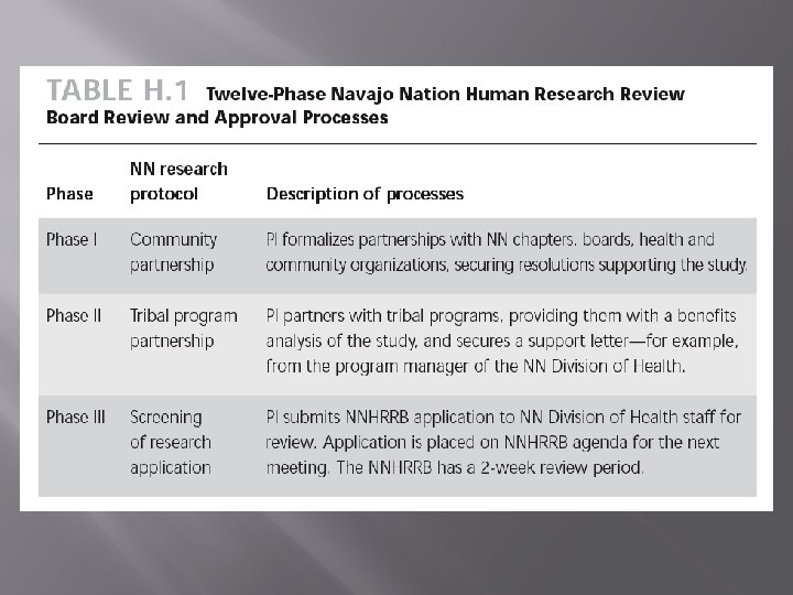 Twelve-phase NNHRRB review and approval process � Phases I – III Involvement & Participation I Community Partnership II Tribal Program Partnership III Screening of Research Application � Phase IV Meeting and Presentation IV NNHRRB Decision-making phase Approve Amend Disapprove