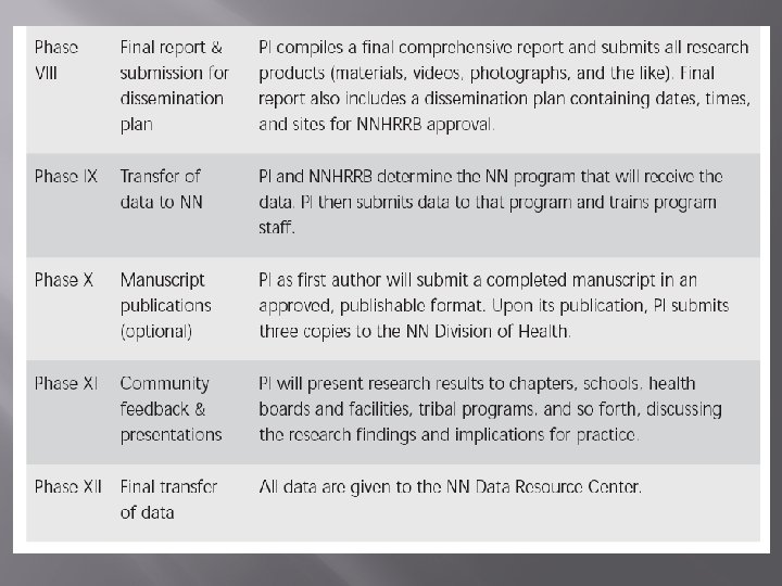 Phases V – VII During phase V, if research is approved in Phase IV the PI within 30 days will receive a one year annually renewable research permit. (Quarterly and annual progress reports are required) l Involvement & Participation Phases V Study implementation VI Data analysis & preliminary findings VII l Data work session Phases VIII – XI Dissemination phases VIII Final report & Dissemination plan IX Transfer of Data to the Navajo Nation X Manuscript publication XI Community feedback & presentations PI will present research results to Chapters, Schools, Health Boards and relevant tribal programs)