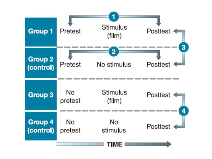 The classical experiment • Experimental and control groups formed • Experimental group: 1. Pretest 2. Stimulus 3. Posttest • Control group: 1. Pretest 2. No stimulus 3. Posttest