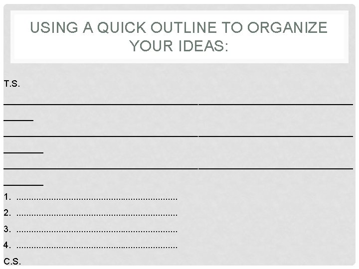 CREATING A TOPIC SENTENCE 1. Look at Topic of Writing. 1. Example: Technology 2. Title: How Technology Affects People’s Lives 2. Write a general statement about that topic that is related to what you will be writing about. Remember, a TS is DIFFERENT than the TITLE of the paper… Example Topic Sentences: A. Technology affects people’s lives in many ways. B. We would be lost without technology in modern life. C. Technology can have either a positive or negative influence on our lives.