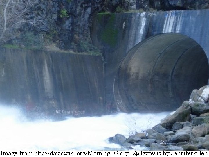 Bell-mouth spillways l Some spillways are designed like an inverted bell so that water can enter all around the perimeter. l These uncontrolled spillway devices are also called morning glory, plughole, glory hole or bell-mouth spillways. l In areas where the surface of the reservoir may freeze, bell-mouth spillways are normally fitted with ice-breaking arrangements to prevent the spillway from becoming ice-bound. l Chaffey Dam, located near Tamworth, New South Wales in Australia has a classic example of an inverted-bell spillway. It was the first one of its kind in Australia.