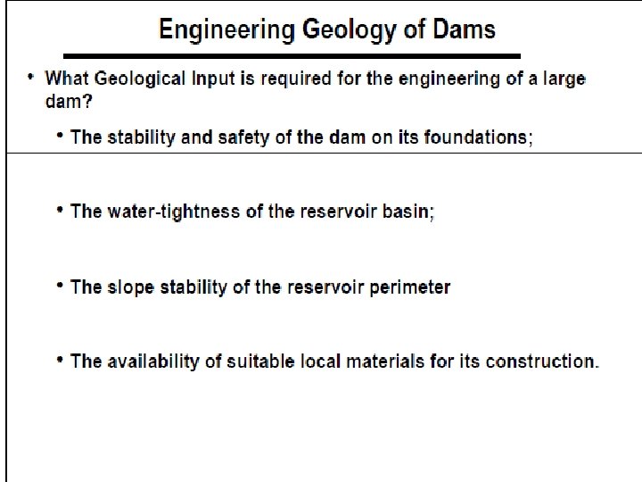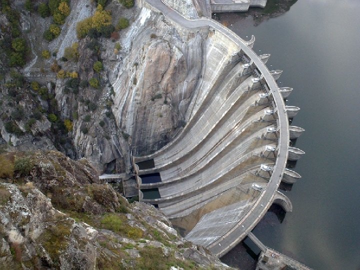 l The material should be granular, very strict grading, with an absence of fines, with high strength, physical and chemical stability. l Aggregates: concret dam require large quantities of aggregates which must come quarries or borrow areas located near dam. l This material should have 25 kn/m 3, uniaxial compressive strength >24 mpa, water absorption <3% and minimum solubility. l Its mineralogical composition should not produce adverse reactions with concrete.