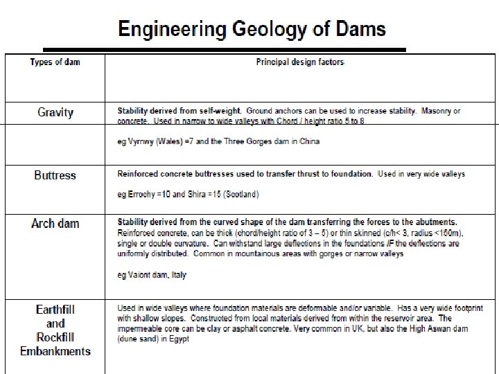 Types of Material: l Cores: are used to prevent water passing through the dam structure. They have low or very low permeability e. g. 10 -5 cm/s or lower. They must not be collapsible, soluble or contains organic matter and they should be easily compactable. Clay and Silt or concrete are suitable material. l Sand with clay content, PI 15 -35 may also be used as alternative. Other include marl and argilites.