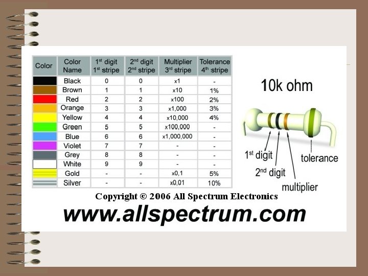 Resistors • Devices used to control the amount of current in a circuit • Symbol of resistor on diagrams • Two types Wire round resistors – coil of thin wire Composition resistors – made of some material that offers resistance (semi-conductor) • Resistors are rated by color code banding