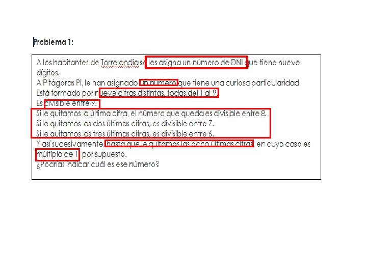Resolución ejercicio 1 • 1. Determina la secuencia textual presente: descripción • 2. Señala cuál es el tipo de párrafo empleado: enumeración descriptiva. • 3. Reconoce el uso de conectores y cuál es la función que tienen dentro del texto: así, sucesivamente, si, hasta • 4. Determina las palabras claves del ejercicio que nos lleven al tema del ejercicio. • 5. ¿Cuál es el tema del problema? Determinar el número que está compuesto de nueve cifras.