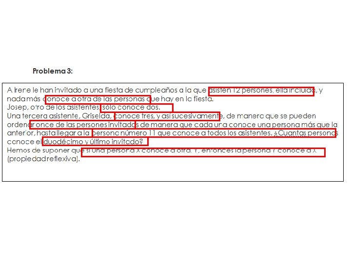 Resolución ejercicio 3 1. Determina la secuencia textual presente: Narración 2. Señala cuál es el tipo de párrafo empleado: Secuencia temporal 3. Reconoce el uso de conectores y cuál es la función que tienen dentro del texto: y, así, sucesivamente, que, hasta, si 4. Selecciona la información que no es relevante en el ejercicio: 5. Determina las palabras claves del ejercicio que nos lleven al tema del ejercicio: 6. ¿Cuál es el tema del problema? Descubrir cuántas personas conoce el duodécimo y último invitado.