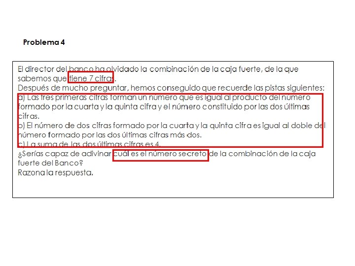 Resolución problema 4 1. Determina la secuencia textual presente: Descripción 2. Señala cuál es el tipo de párrafo empleado: problema/solución. 3. Reconoce el uso de conectores y cuál es la función que tienen dentro del texto: y, que 4. Selecciona la información que no es relevante en el ejercicio: 5. Determina las palabras claves del ejercicio que nos lleven al tema del ejercicio: 6. ¿Cuál es el tema del problema? Concluir el número secreto de la combinación de la caja fuerte del banco.