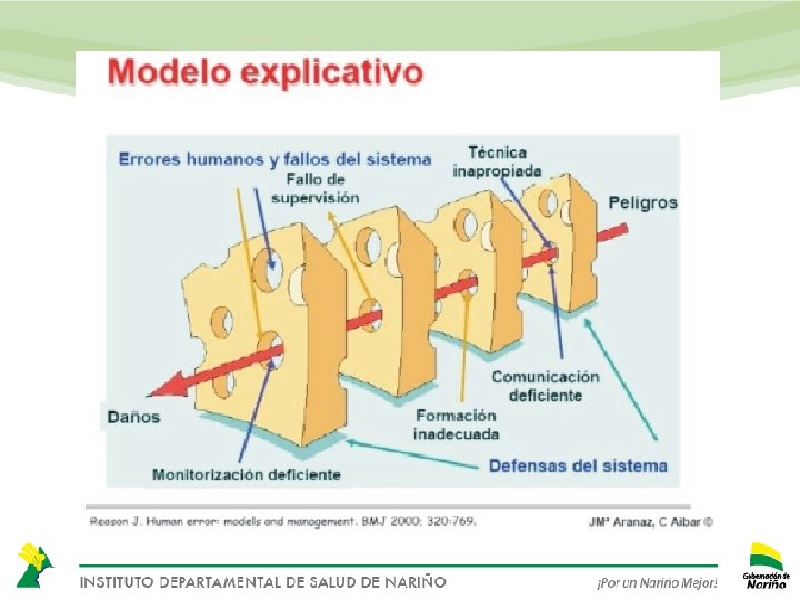 SEGURIDAD DEL PACIENTE MODELO EXPLICATIVO • Debemos buscar a partir de aquellos errores humanos, o de aquellas fallas del sistema, cuáles son esas fallas en los procesos que se están alineando para permitir que el dañó se dé, para poder llenar así el sistema de múltiples barreras de seguridad, lo que llamamos sistemas redundantes de seguridad que impidan que el daño se de, que rellenen esos huecos, en cada una de las rodajas del Queso Suizo