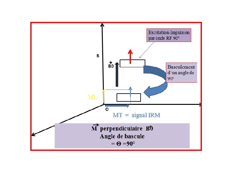 L’aimantation M fait avec: le champ B 0, un angle θ = 90°. M se décompose en : M se décompose en -MT qui est projetée sur l’axe XOY -ML sur l’axe OZ // B 0.