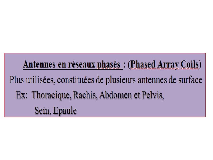 Antennes de surface : -Homogènes, réceptrices uniquement -Planes, Circulaires, Rectangulaires, -Flexibles adaptées à l’organe à étudier. Ex : antenne rachis, épaule, poignet