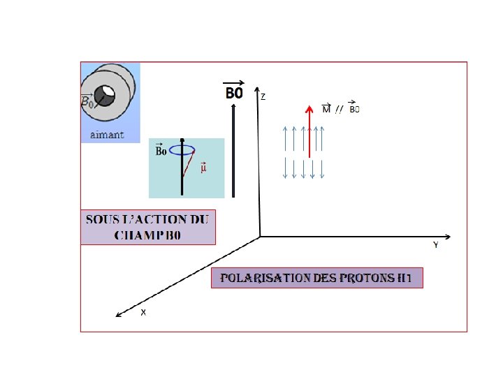 L’aimantation M fait avec: le champ B 0, un angle θ = 90°. M se décompose en : M se décompose en -MT qui est projetée sur l’axe XOY -ML sur l’axe OZ // B 0.