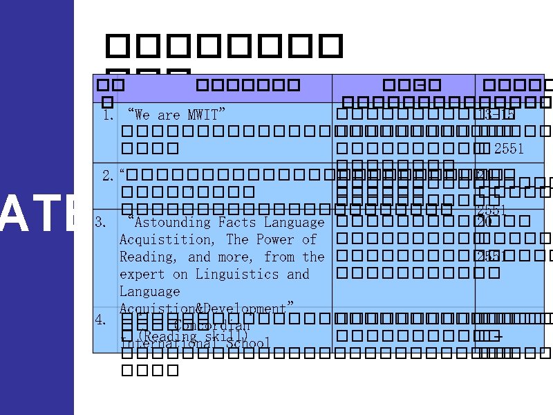 ������ 2549 2550 2551 �� ������ AVERAGE 451. 61 466. 28 466. 39 � (CU-TEP) MAX 604. 00 662. 00 579. 00 EVEMENT MIN S. D. TOEFL 500 up(�� ) 377. 00 39. 23 26 374. 00 46. 10 46 380. 00 41. 69 41