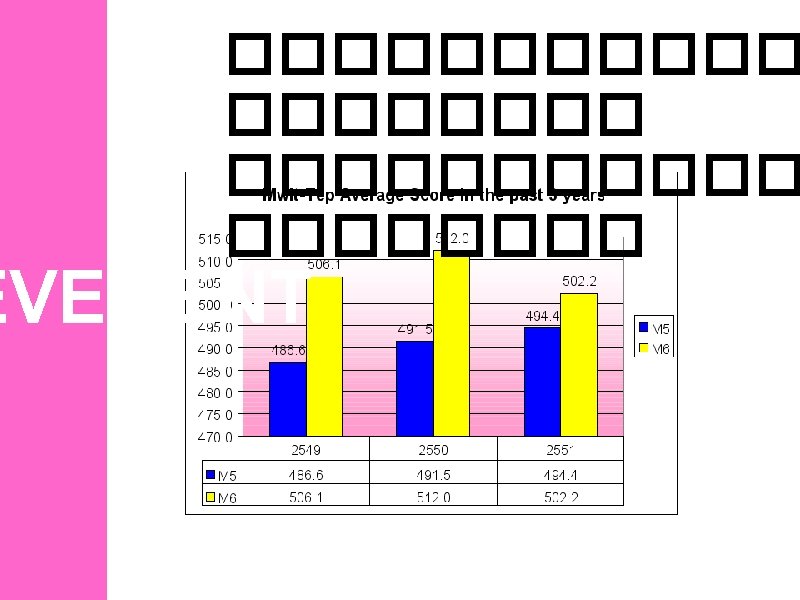 Subject Year National x English 2005 30. 93 EVEMENT S. D. School x Note S. D. 10. 77 71. 99 11. 18 Mahidol med. = national x +3. 81 2006 32. 37 12. 21 74. 97 10. 19 Mahidol med. = national 2007 26. 88 10. 66 63. 82 4. 60 x +3. 49 Mahidol med. = national x +3. 47 Comparison of ONET Scores at National level with Mahidol Wittayanusorn School, 20052007