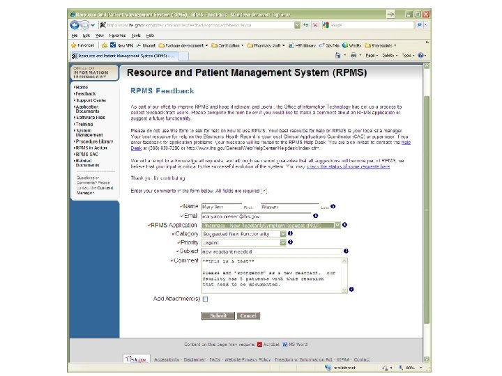 Entering Feedback • Go to: http: //www. ihs. gov/RPMS/index. cfm? module=feedback& option=add&newquery=1 – Optionally, go to http: //www. ihs. gov/RPMS and click Feedback in the left-hand menu • Fill out the available form, using the RPMS Application “Pharmacy – New Reactant/Symptom Request (PRSR)” • These will be reviewed promptly, and will be added through patch updates on a regular basis as needed