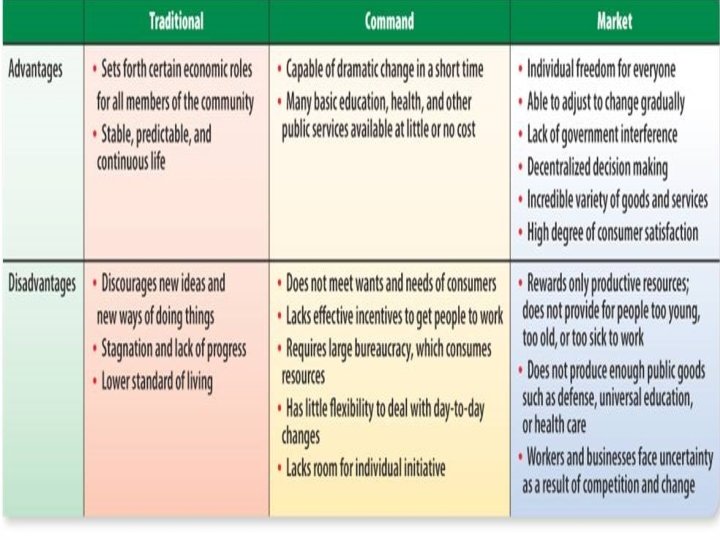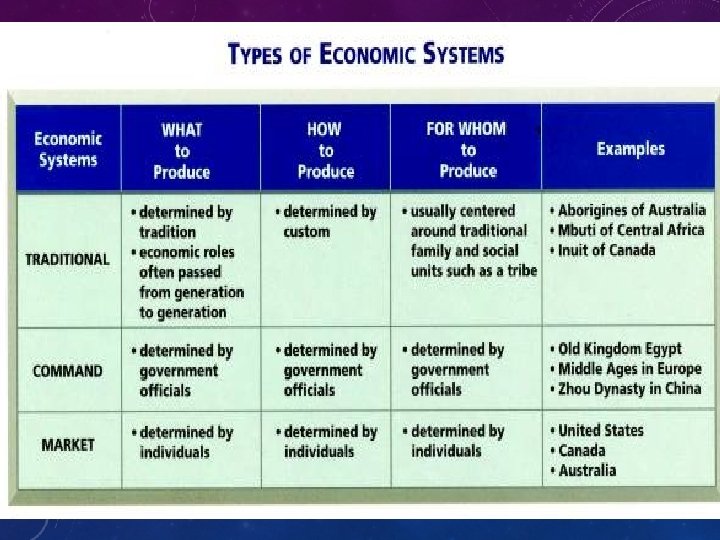 COMMAND ECONOMY • The central government alone decides how to answer all three key economic questions. • Also Called: centrally planned economies • Details: • Central authority is in command of the economy