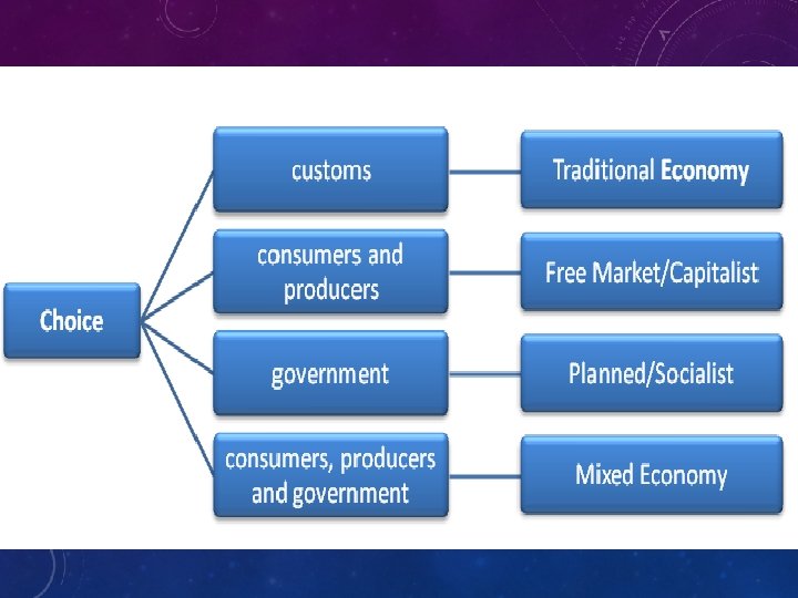 RESOURCES ARE SCARCE = ECONOMIES ADDRESS 3 ECONOMIC QUESTIONS: 1. What goods and services should be produced? 2. How should these good and services be produced? 3. For Whom to produce these goods and services?