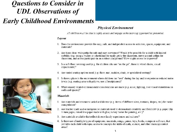. . . Consider Universal Design for Learning (UDL) principles to create accessible environments UDL means the removal of physical and structural barriers (UD) and the provision of multiple and varied formats for instruction and learning (UDL).