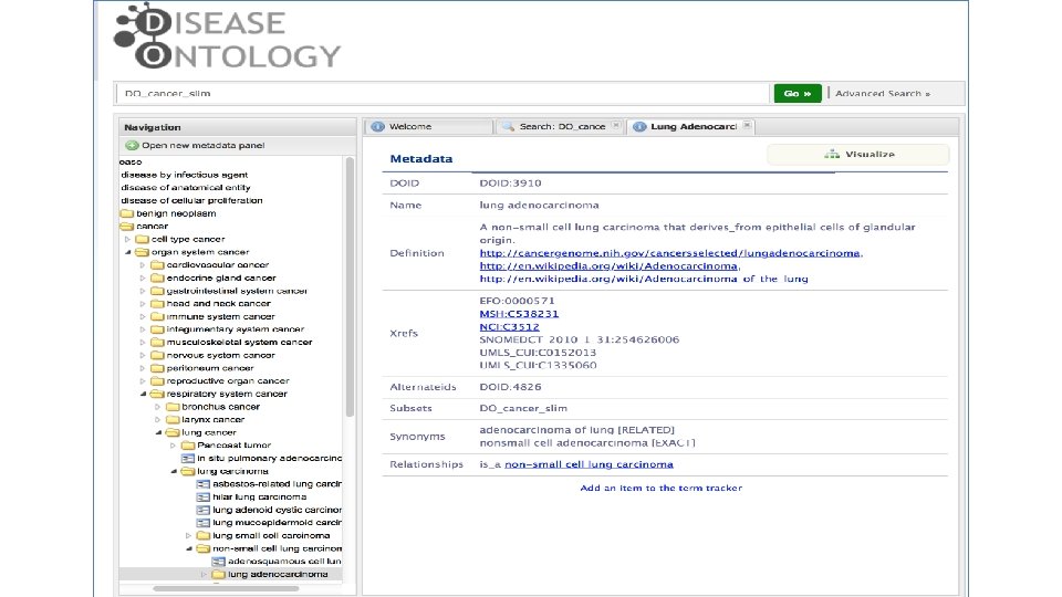 Disease Ontology (DO) Cancer Project DO_Cancer_Slim version 1. 0 SOURCE: COSMIC, TCGA, ICGC, TARGET, Int. OGen, EDRN 386 original cancer terms (w/o benign) Mapped to 187 DO child node terms 63 (59 organ system & 4 cell type) top-level DO cancer terms Wu TJ, Schriml LM, Chen QR, Colbert M, Crichton DJ, et al. 2015. Generating a focused view of disease ontology cancer terms for pan-cancer data integration and analysis. Database (Oxford). 2015: bav 032.
