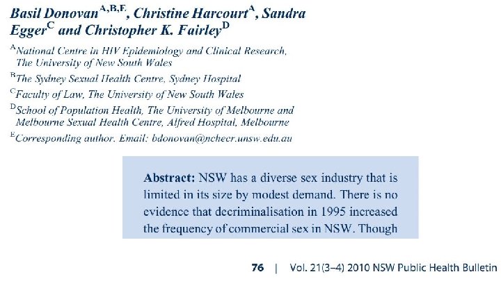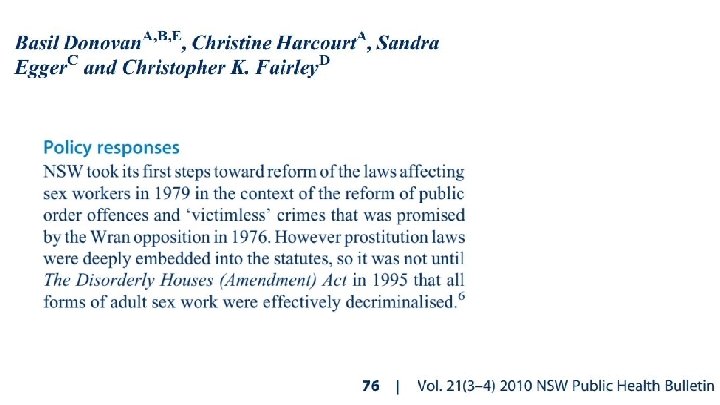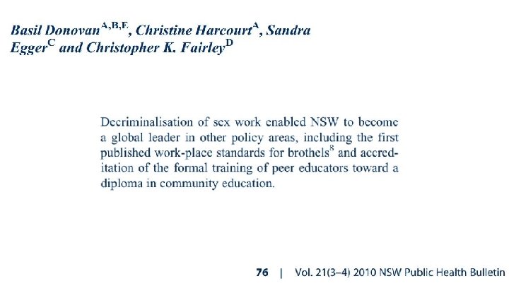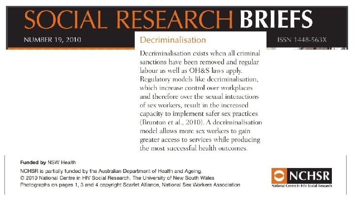 What would decriminalisation mean in Qld? REMOVE - Police as regulators Licensing provisions PETF & PLA PINS Entrapment Criminalisation Prostitution Act 1999 Criminal Code 1899 s 22 A Police Powers & Responsibilities Act 2000 GIVE ACCESS TO - Privacy protections Anti-Discrimination law Taxation law Industrial Relations Act 2016 Workplace Health & Safety Act, Regulations, Codes of Practice 2011 Town Planning regulations Amenity & Aesthetics regulations Fair Work Act 2009 Public Health Act 2005