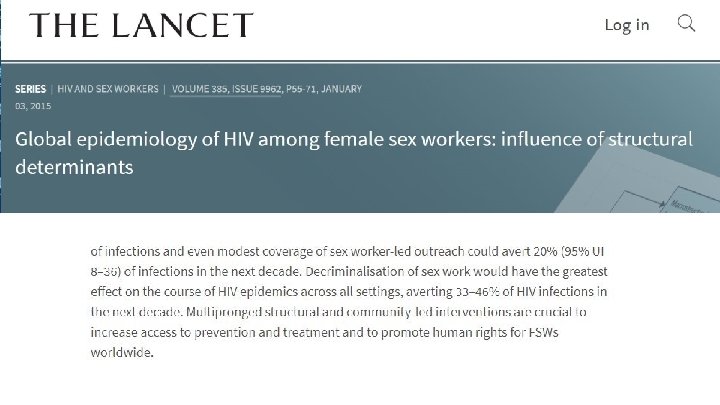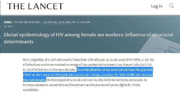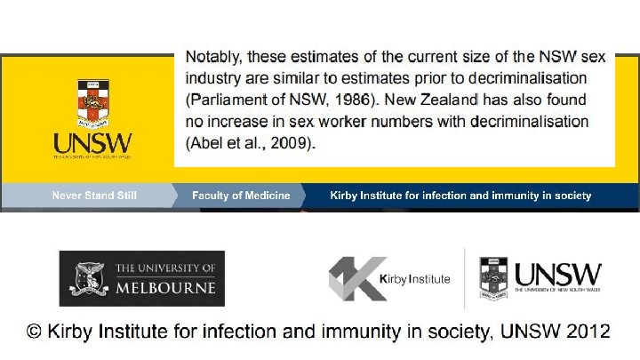There are 3 internationally recognisable frameworks for the regulation of sex work (UN, WHO, ILO, The Lancet, Kirby Institute, Amnesty International): 1. Criminalisation, everything is illegal, sex work is a crime 2. Legalisation/licensing, partially legal but mostly criminalised, sex work is a ‘social ill’, ie Queensland, 3. Decriminalisation, grants sex workers access to existing protections & justice, sex work is work, ie New Zealand, New South Wales