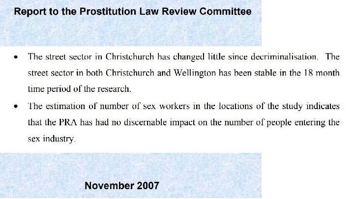 Decriminalisation is not: A lack of regulation A ‘laissez faire’ approach The deregulation of sex work Decriminalisation does not: Increase the size of the industry Increase the number of sex workers Increase the number of brothels