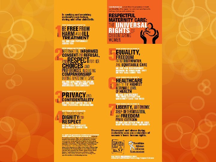 Suggestions 1. How Respectful was YOUR maternity care experience? Share your story as a receiver or provider of maternity care or ask your mother, sister, wife, daughter to tell you about her experiences. Please submit to: takeaction@whiteribbonalliance. org 2. What does RESPECTFUL MATERNITY CARE look like? Get creative and share your vision of RMC in any medium (painting, photography, video, poetry, collage, drawing) . Please submit to: takeaction@whiteribbonalliance. org 3. Host a discussion with friends, colleagues or community members about respectful maternity care. Download this Power. Point and tips for discussion.
