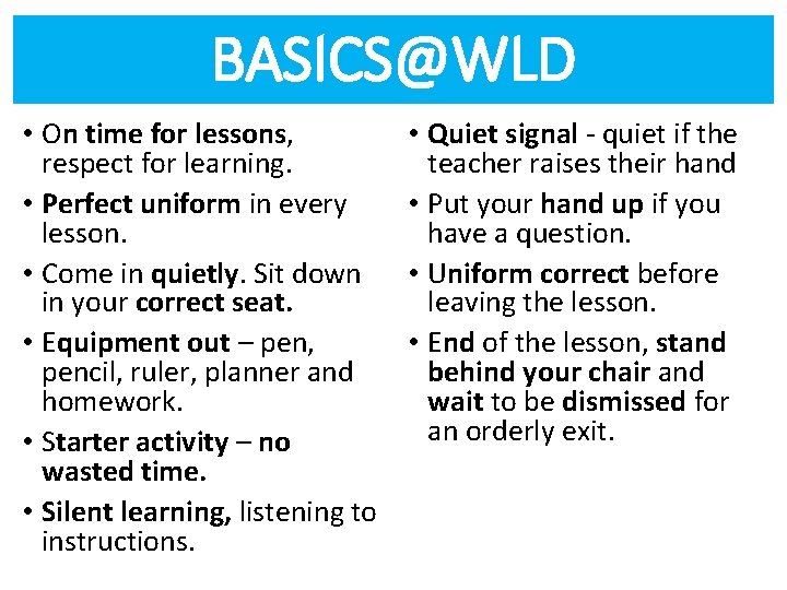 BASICS@WLD • On time for lessons, respect for learning. • Perfect uniform in every lesson. • Come in quietly. Sit down in your correct seat. • Equipment out – pen, pencil, ruler, planner and homework. • Starter activity – no wasted time. • Silent learning, listening to instructions. • Quiet signal - quiet if the teacher raises their hand • Put your hand up if you have a question. • Uniform correct before leaving the lesson. • End of the lesson, stand behind your chair and wait to be dismissed for an orderly exit.