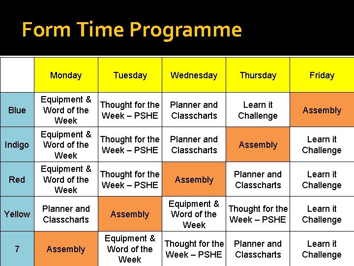 Form Time Programme Monday Wednesday Thursday Friday Blue Equipment & Thought for the Word of the Week – PSHE Week Planner and Classcharts Learn it Challenge Assembly Indigo Equipment & Thought for the Word of the Week – PSHE Week Planner and Classcharts Assembly Learn it Challenge Red Equipment & Thought for the Word of the Week – PSHE Week Assembly Planner and Classcharts Learn it Challenge Yellow 7 Planner and Classcharts Assembly Tuesday Assembly Equipment & Thought for the Word of the Week – PSHE Week Planner and Classcharts Learn it Challenge