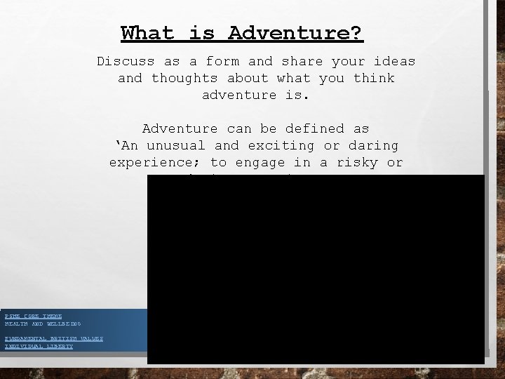 What is Adventure? Discuss as a form and share your ideas and thoughts about what you think adventure is. Adventure can be defined as ‘An unusual and exciting or daring experience; to engage in a risky or daring experience PSHE CORE THEME HEALTH AND WELLBEING FUNDAMENTAL BRITISH VALUES INDIVIDUAL LIBERTY