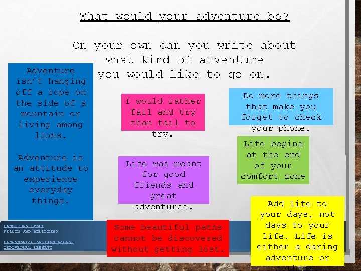 What would your adventure be? On your own can you write about what kind of adventure Adventure you would like to go on. isn’t hanging off a rope on the side of a mountain or living among lions. Adventure is an attitude to experience everyday things. PSHE CORE THEME HEALTH AND WELLBEING FUNDAMENTAL BRITISH VALUES INDIVIDUAL LIBERTY I would rather fail and try than fail to try. Life was meant for good friends and great adventures. Some beautiful paths cannot be discovered without getting lost. Do more things that make you forget to check your phone. Life begins at the end of your comfort zone Add life to your days, not days to your life. Life is either a daring adventure or