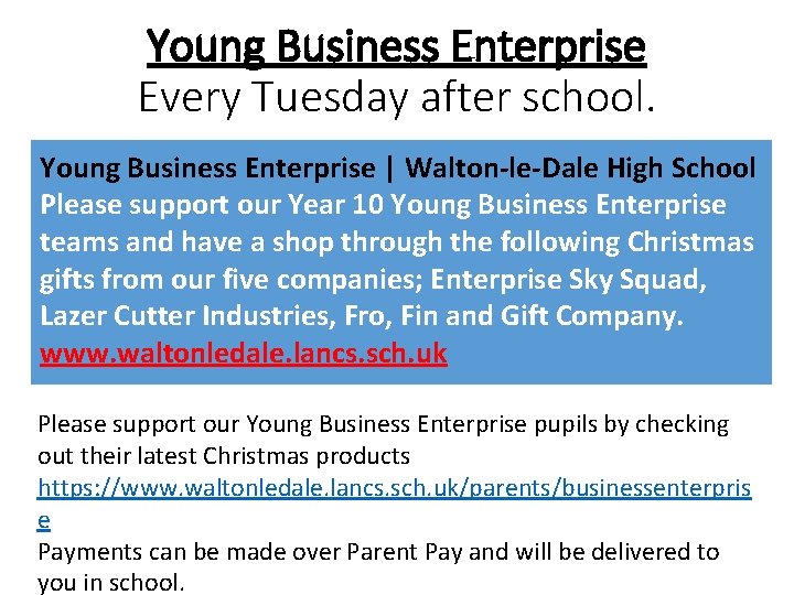 Young Business Enterprise Every Tuesday after school. Young Business Enterprise | Walton-le-Dale High School Please support our Year 10 Young Business Enterprise teams and have a shop through the following Christmas gifts from our five companies; Enterprise Sky Squad, Lazer Cutter Industries, Fro, Fin and Gift Company. www. waltonledale. lancs. sch. uk Please support our Young Business Enterprise pupils by checking out their latest Christmas products https: //www. waltonledale. lancs. sch. uk/parents/businessenterpris e Payments can be made over Parent Pay and will be delivered to you in school.