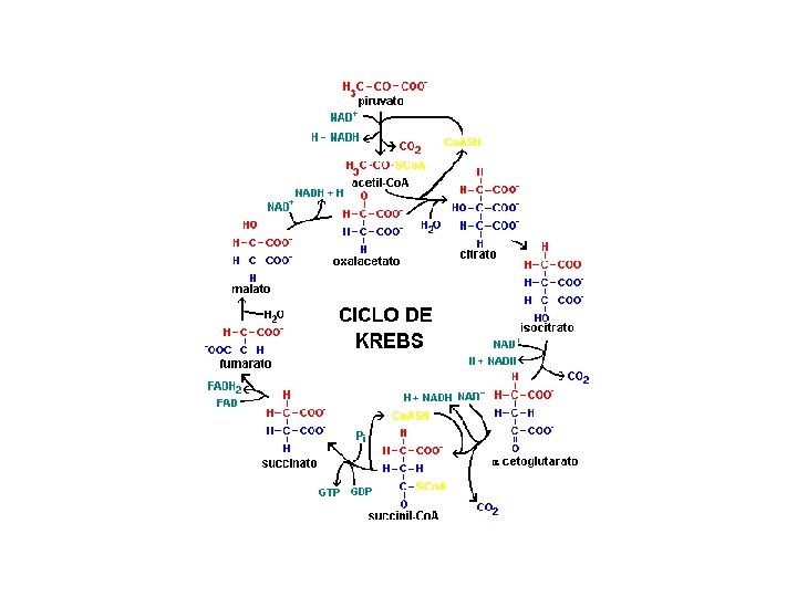 Ciclo de Krebs Ocurre en la matriz mitocondrial. Resultado: CO 2 y electrones ricos en energía, que pasan vía NADH y FADH 2 a la cadena respiratoria. El CO 2 se elimina como producto de deshecho, mientras que los electrones de alta energía se desplazan por la cadena respiratoria y finalmente se combinan con O 2 y forman H 2 O.