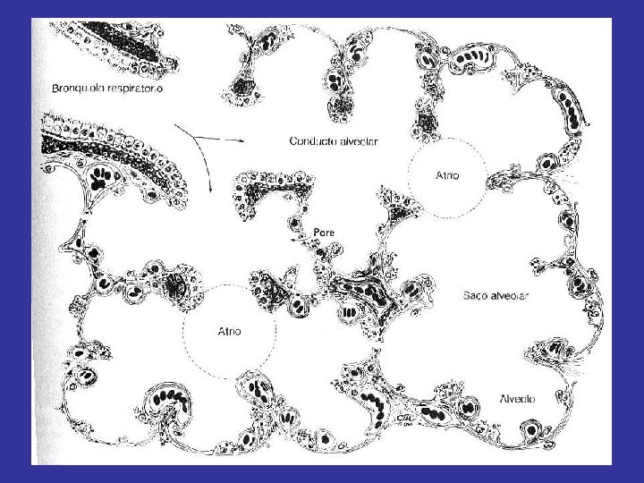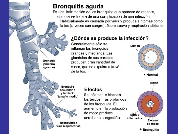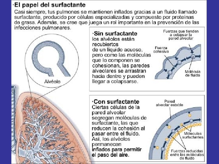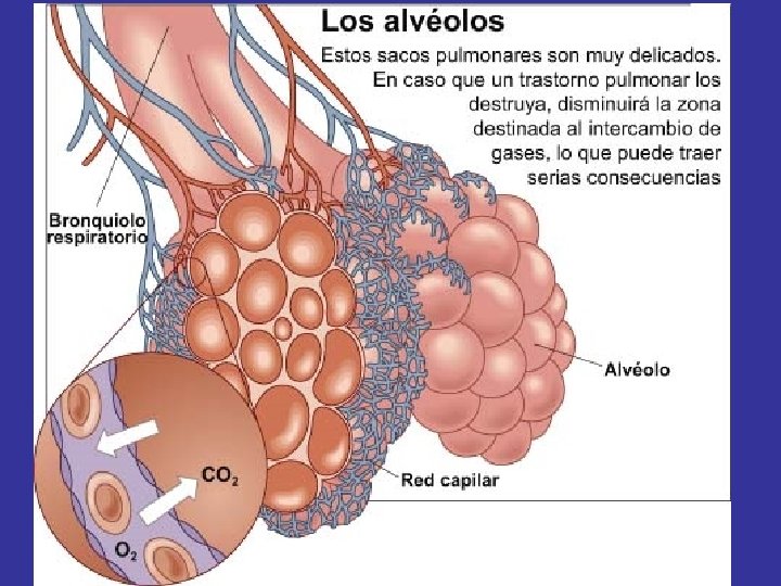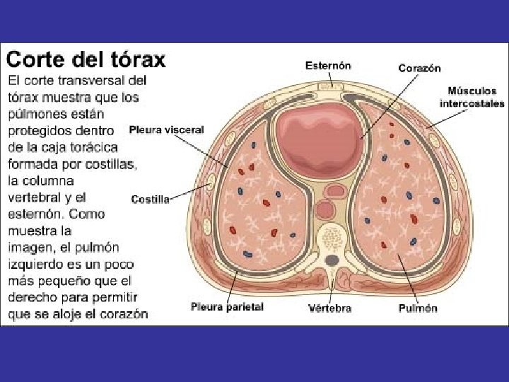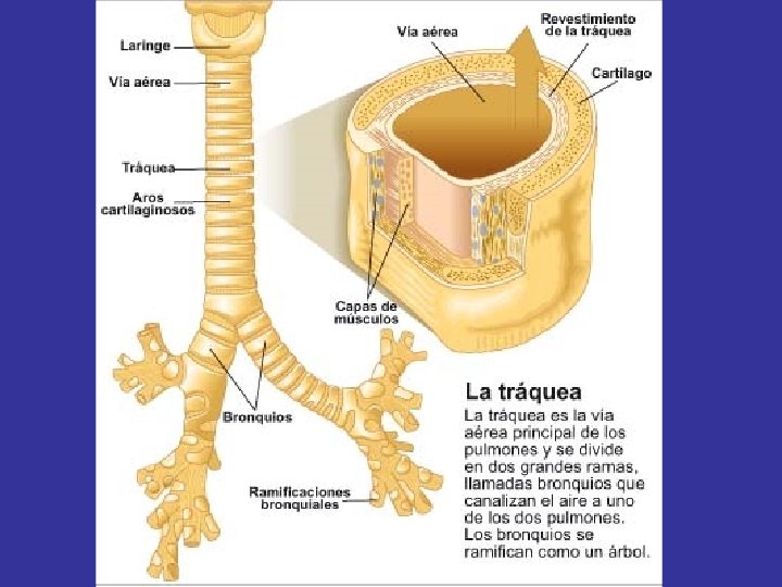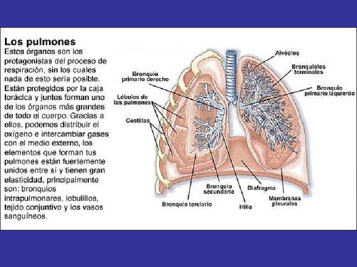 • TRÁQUEA: Formada por semianillos cartilaginosos y cuya mucosa está tapizada de pestañas vibrátiles. • BRONQUIOS: Derecho e izquierdo, que se ramifican en el interior de los pulmones, hasta llegar a ser bronquiolos. • PULMONES: El pulmón derecho tiene tres lóbulos, el izquierdo dos. Es donde tiene lugar el intercambio de gases. • PLEURA: Los movimientos de la caja torácica son transmitidos al tejido pulmonar gracias a la pleura, que recubre los pulmones y posee dos capas, una visceral y otra parietal.