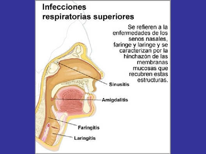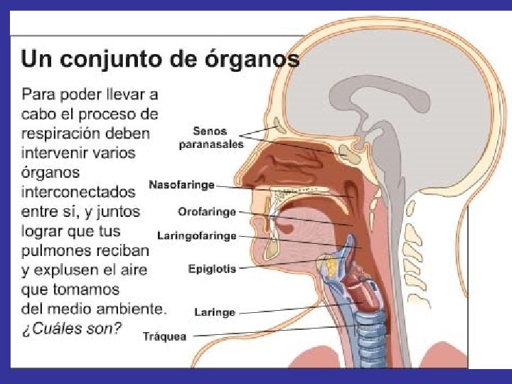 Los órganos a los que hay que hacer referencia son: • NARIZ. FOSAS NASALES: Consta de dos partes, una externa, o nariz propiamente dicha, y otra interna, situada en el techo de la boca, que calientan, filtran y humedecen el aire gracias a la mucosa pituitaria. • FARINGE: Es el entrecruzamiento de vías aéreas y vías digestivas. • LARINGE: se encuentran las cuerdas vocales, es el órgano de la voz o fonación. • EPIGLOTIS: Válvula suspendida sobre el orificio de la laringe, se cierra en el momento de la deglución para evitar la entrada del bolo alimenticio en las vías respiratorias.