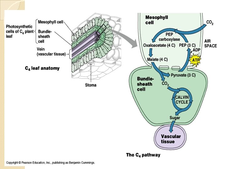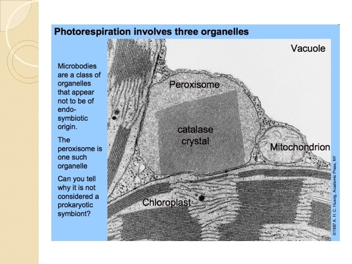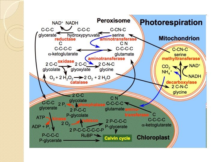 �rubisco, initiates carbon fixation in the Calvin cycle; it also combines with oxygen to initiate photorespiration. �The active site of rubisco cannot distinguish the two similar substrates: O=C=O and O=O. �Photorespiration 30% Calvin cycles. �In chloroplast, rubisco, combines with (Ru. BP) and oxygen. five-carbon Ru. BP split into two-carbon 2 phosphoglycolate and three-carbon 3 phosphoglycerate (PGA). � 2 -phosphoglycolate is converted to glycolate in chloroplast, transported into peroxisome �glycolate oxidized by oxygen to glyoxylate and hydrogen peroxide and converted to water and oxygen �glyoxylate converted to glycine in peroxisome and