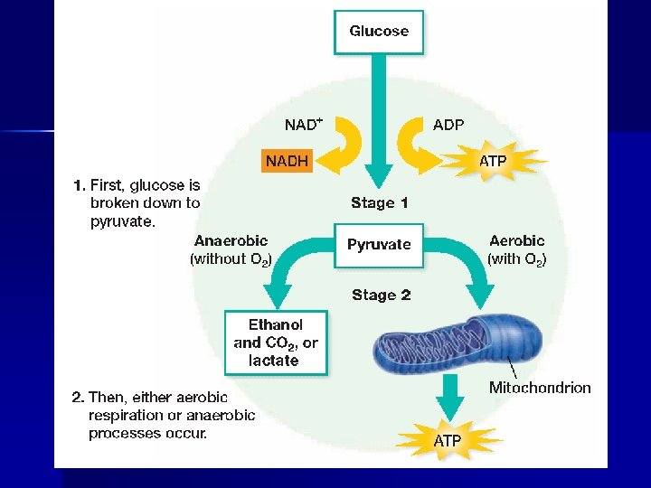 Fermentation n Alcoholic – The conversion of glucose into an alcohol – This occurs in yeast and bacteria – The final products are CO 2 and alcohol