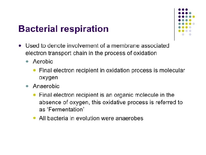 Types of Anaerobic Respiration • Lactic acid fermentation – In this type of anaerobic respiration, glucose is split into two molecules of lactic acid to produce two ATP. • C 6 H 12 O 6 (glucose)+ 2 ADP + 2 phosphate → 2 lactic acid + 2 ATP • Alcoholic fermentation – In this type of anaerobic respiration, glucose is split into ethanol, or ethyl alcohol. This process also produces two ATP per sugar molecule • C 6 H 12 O 6 (glucose) + 2 ADP + 2 phosphate → 2 C 2 H 5 OH (ethanol) + 2 CO 2 + 2 ATP • Other types of fermentation – Other types of fermentation are performed by some bacteria and archaea. These include proprionic acid fermentation, butyric acid fermentation, solvent fermentation, mixed acid fermentation, butanediol fermentation, Stickland fermentation, acetogenesis, and methanogenesis.