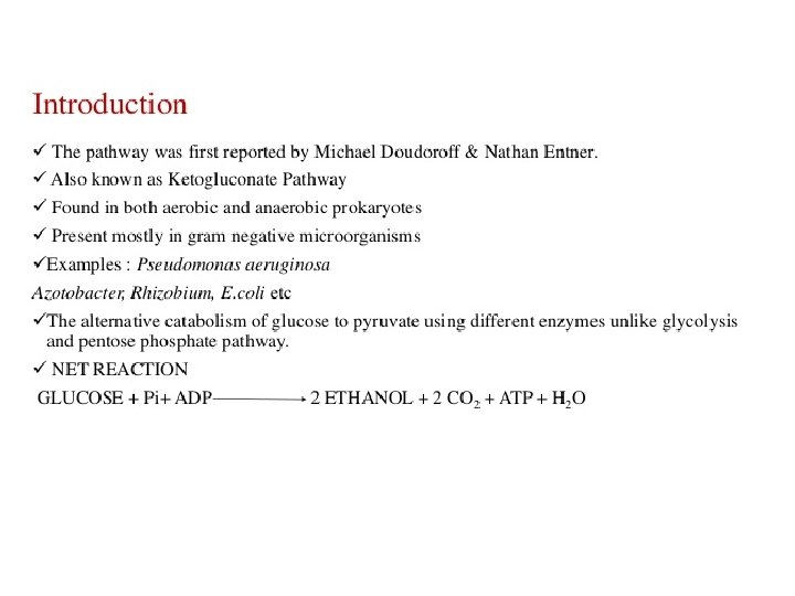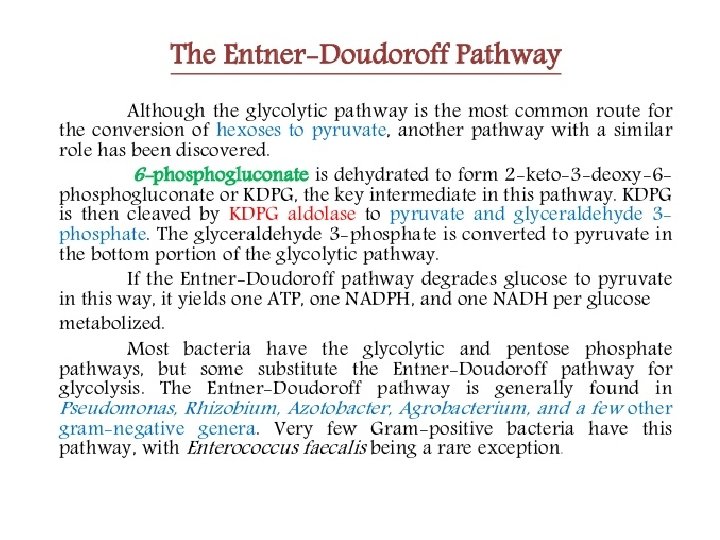 • Glycolysis is the process by which glucose is broken down anaerobically into incompletely oxidized compounds like pyruvate, a process which is usually coupled to the synthesis of 2 ATP and 2 NADH for every one glucose molecule processed. • ED pathway occurs only in prokaryotes and it uses 6 phosphogluconate dehydratase and 2 -keto-3 deoxyphosphogluconate aldolase to create pyruvate from glucose. ED pathway produces only one ATP per glucose—half as much as the EMP pathway. .