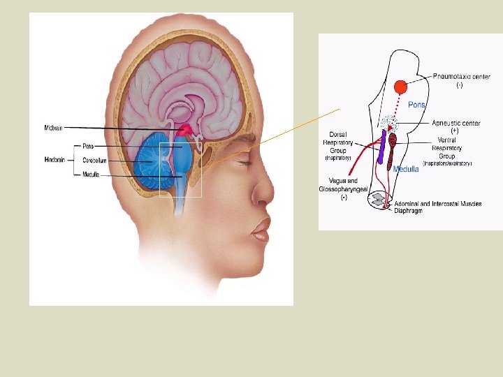Control of Breathing PRIMARY MECHANISM [CO 2] and [H+] (including all ways that they are carried) within the blood are the primary stimuli that affect a person’s breathing rate/depth. (For simplicity’s sake, in Bio 12, we will assume that an increase in breathing rate is accompanied by an increase in breathing depth, and vice versa). • CO 2 and H+ levels in the blood (including all ways that they are carried) are detected by chemoreceptors (chemical-sensitive nerve endings) in the Respiratory Center of the MEDULLA OBLONGATA in the brainstem (top of spinal cord). • The Medulla Oblongata is the part of the brain that controls the body’s organ systems. (p. 334 -335) • The respiratory center is a cluster of nerve cells that trigger inspiration through automatic, rhythmic discharges. •