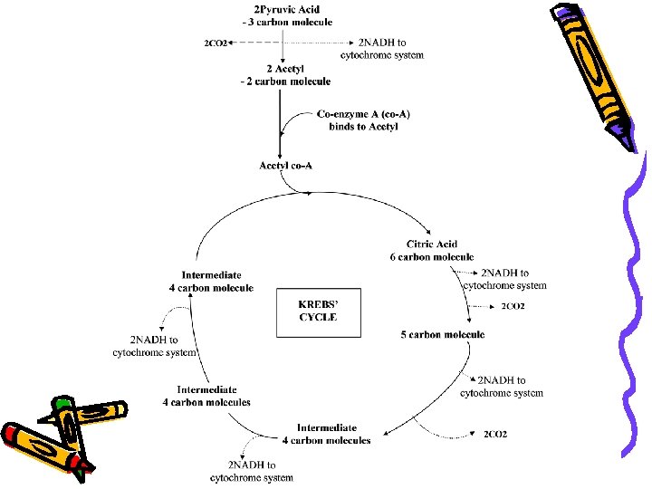 Krebs’ Cycle • The 6 C citric acid is gradually converted back to the 4 -Carbon compound by a series of enzyme controlled reactions which release carbon dioxide and hydrogen (which combines with NAD).