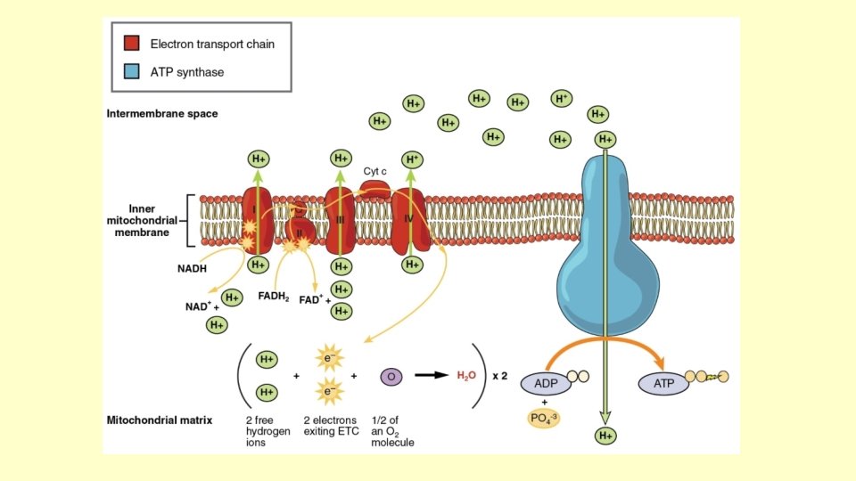 Krebs • Still in the matrix of the Mitochondria • Lots of Steps lots made and broken down • Net products for one turn are • CO 2 X 2 - Waste • ATP X 1 - Energy • NADH+H+ X 3 – Oxidative Phosphorylation • FADH 2 X 1 – Oxidative Phosphorylation