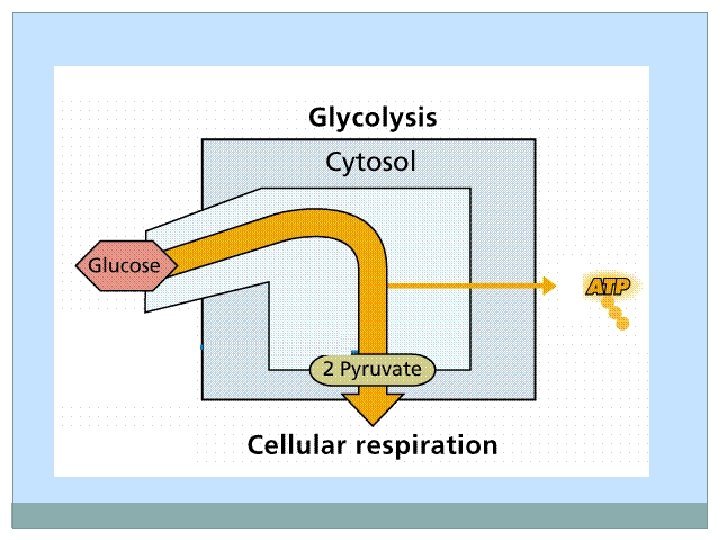 Stage 1 – called Glycolysis Happens in the cytosol 6 -carbon Glucose is converted to two 3 carbons molecules of pyruvate A small amount of ATP is MADE No oxygen is needed
