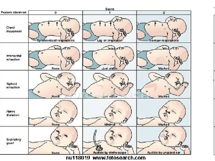 Silverman Anderson retraction score • Score • • Upper Lower chest retraction Xiphoid retraction Nasal dilatation Grunt None • 0 Synch None • 1 • Lag on inspiration Just visible Minimal Stethoscope only • 2 See-Saw Marked Naked ear • A score of >6 is indicative of impending respiratory failure.
