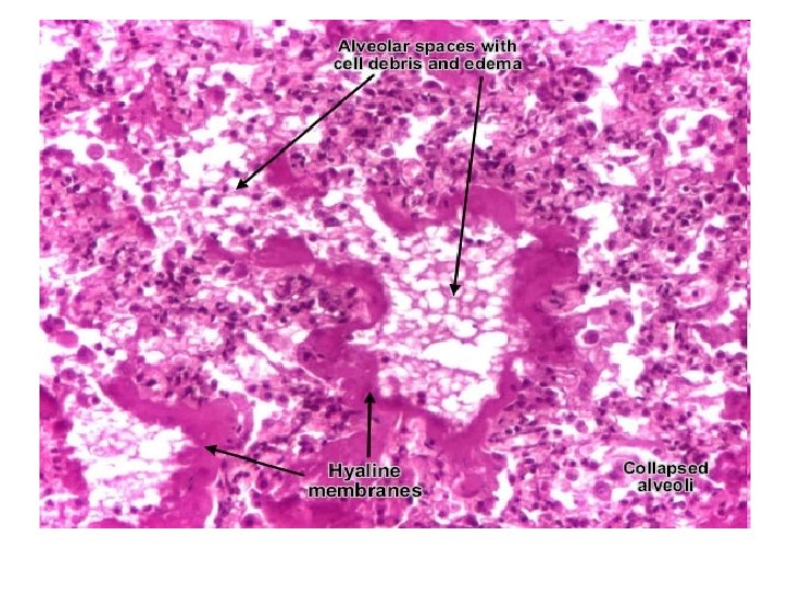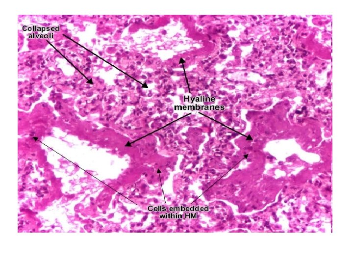 . Neonatal Respiratory Distress Syndrome - NRDS (Hyaline membrane disease) is characterized by collapsed alveoli alternating with hyperaerated alveoli, vascular congestion and hyaline membranes (resulted from fibrin, cellular debris, red blood cells). Hyaline membranes appear like an eosinophilic, lining or filling the alveolar spaces and blocking the gases exchange.