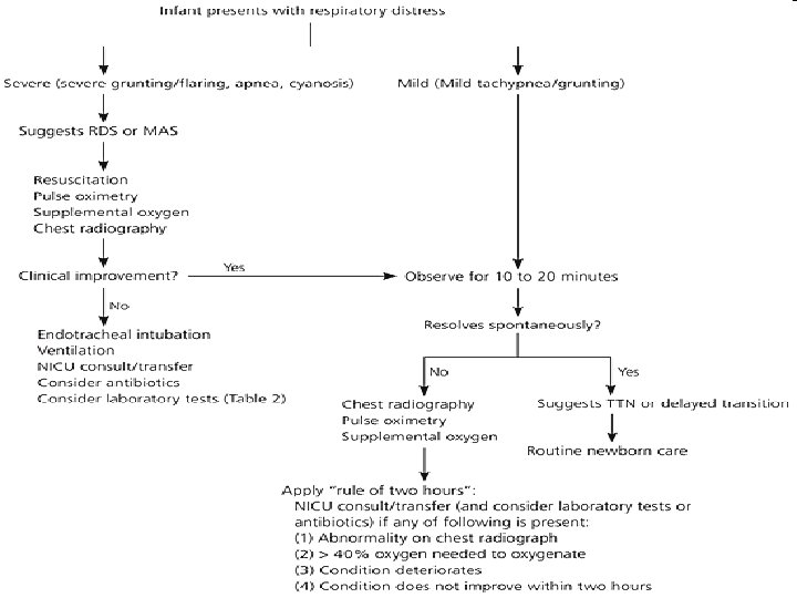 Differential Diagnosis of Respiratory Distress in the Newborn • • Most common causes * Transient tachypnea of the newborn Respiratory distress syndrome (hyaline membrane disease) Meconium aspiration syndrome Less common but significant causes Infection (e. g. , pneumonia, sepsis) Nonpulmonary causes (e. g. , anemia, congenital heart disease, congenital malformation, medications, neurologic or metabolic abnormalities, polycythemia, upper airway obstruction) Persistent pulmonary hypertension of the newborn Pneumothorax * -Listed in order of incidence.