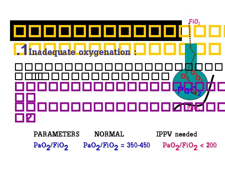 ������ Oxygenation failure : A. normal (Aa)O 2, Fi. O 2. . . … A 1. Decrease Fi. O 2 PAO 2 CO 2 PA O 2 Pa. O 2 A 2. CO 2 retention